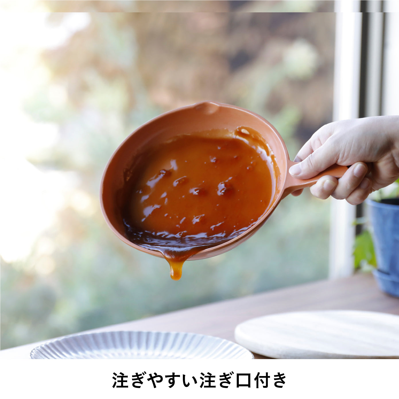 ソースなどが注ぎやすい注ぎ口が両側に付いており、右利きでも左利きでもどちらでも使いやすい仕様です。本体は軽量なアルミニウム製(角型315g/丸型288g)なので、余計な力を使わずに使用できます。