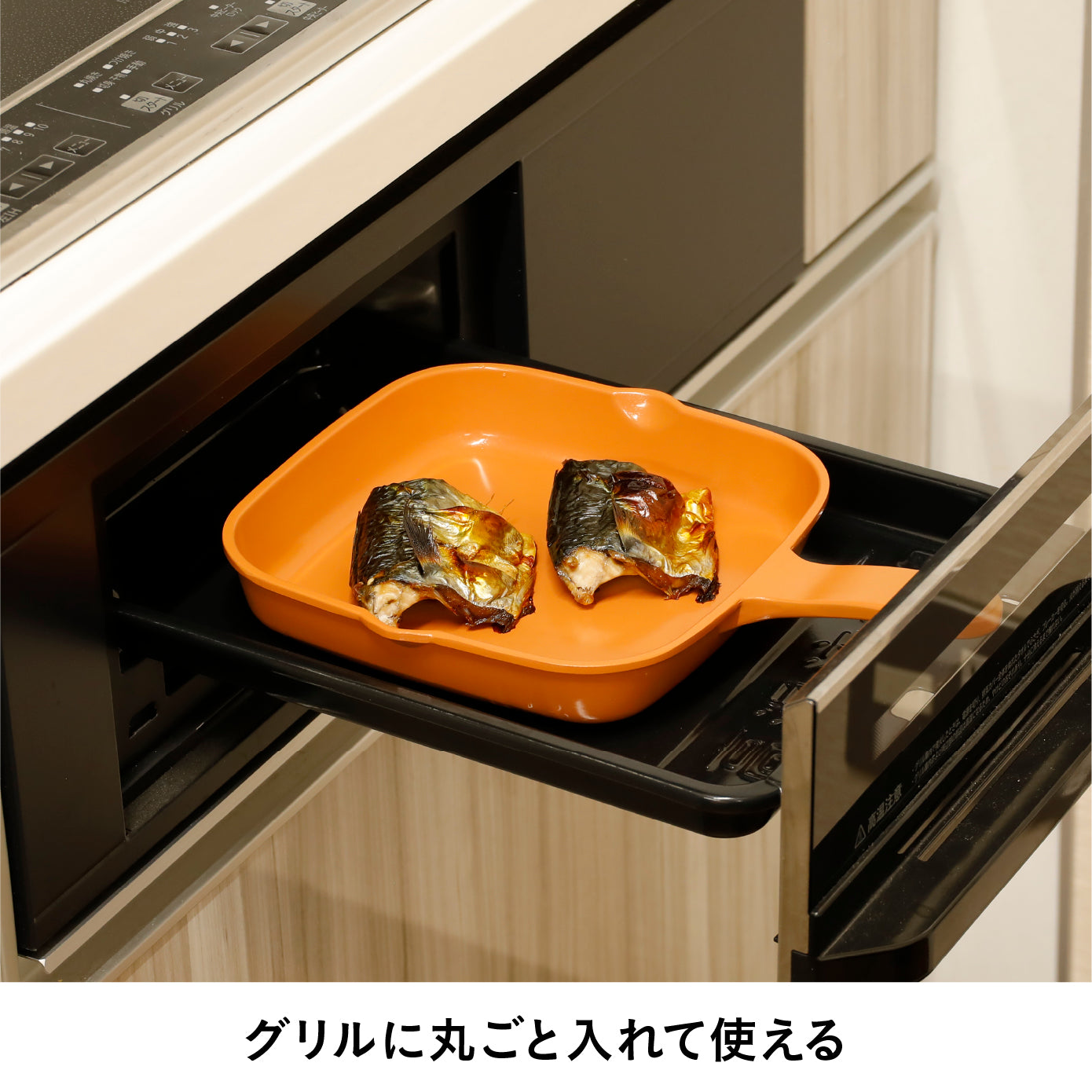 角型18×18cm、丸型19cmのどちらも魚焼きグリルにぴったり収まるサイズ感です。グリルプレートを使用することで、グリル内に汚れが付きにくくなり簡単に調理ができます。