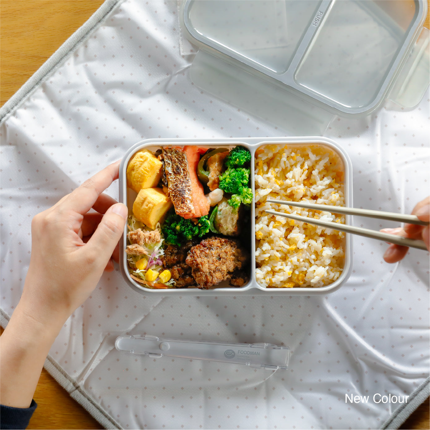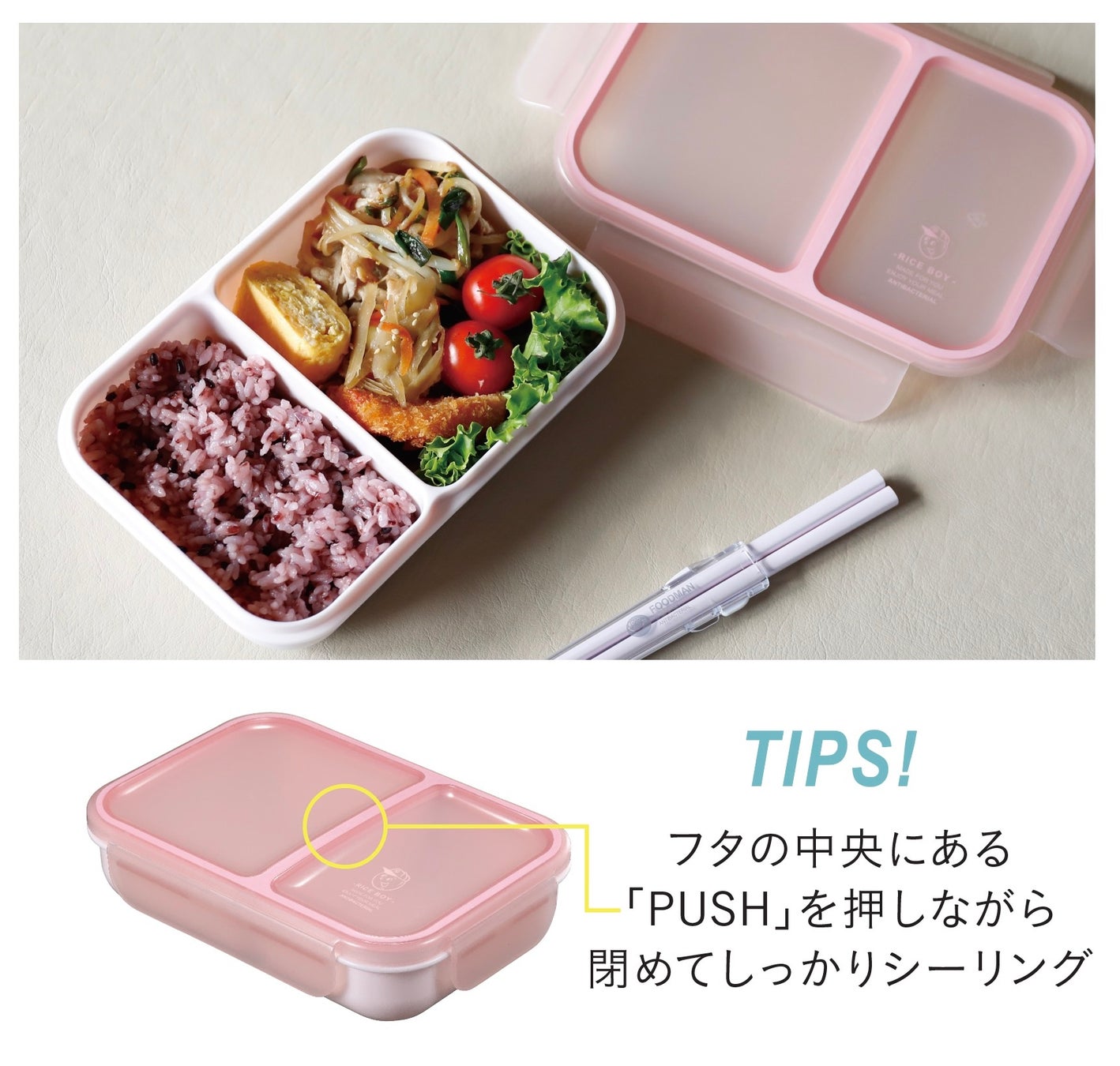 ダブルシーリング構造がお弁当内での汁漏れを防ぎ、食材同士の味移りを防いで美味しく食べられます。また汁漏れを防ぐために、フタの閉め方にもちょっとしたコツがあります。フタの中央に「PUSH」のマークがあるので、そこを押しながら閉めるとより密閉度が上がります。