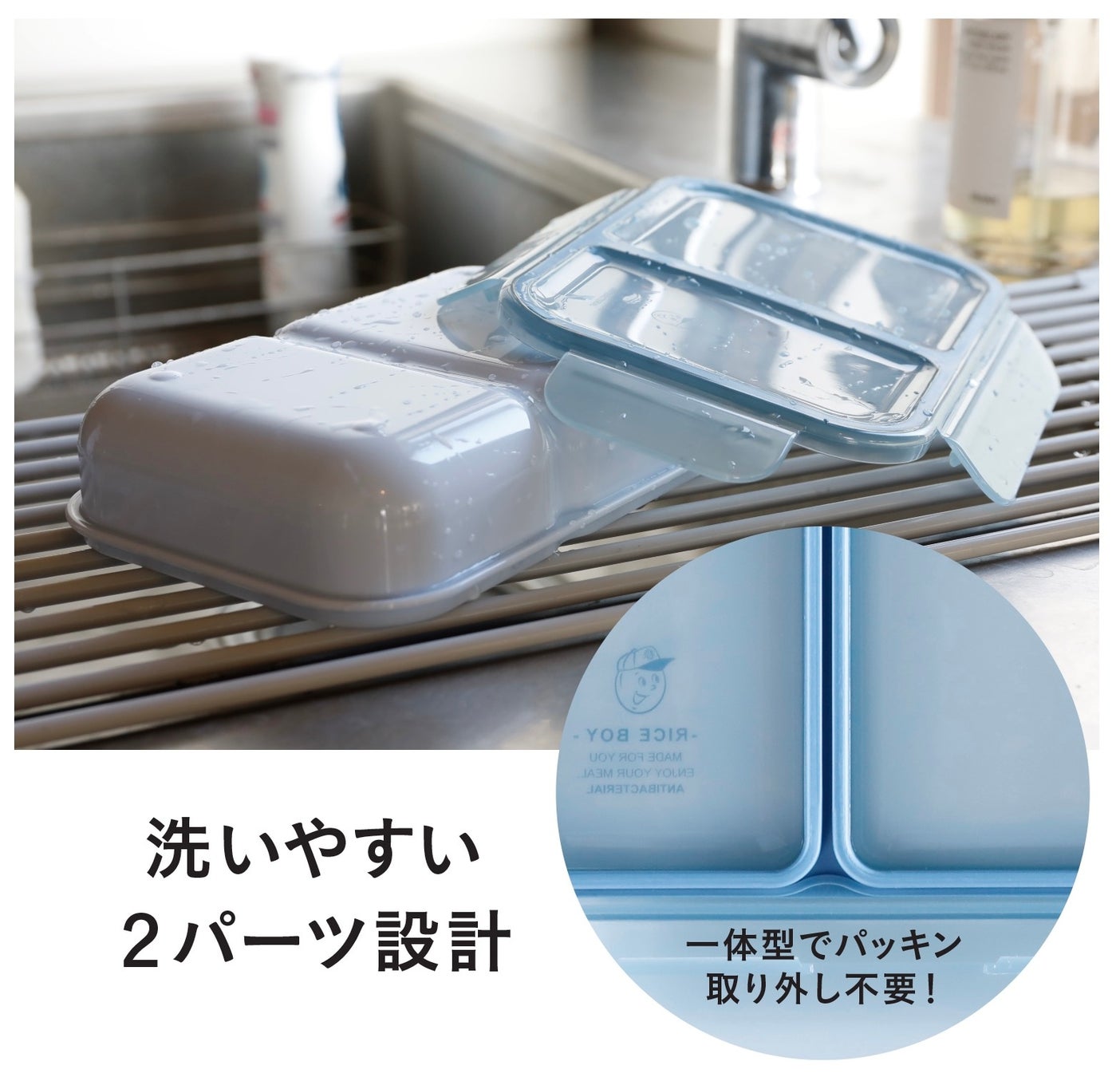 独自のパッキン一体型のフタによって汁漏れを防ぎつつ、面倒なパッキンの付け外しがないシンプルな構造に仕上げました。さらに抗菌加工が施されているので安心!