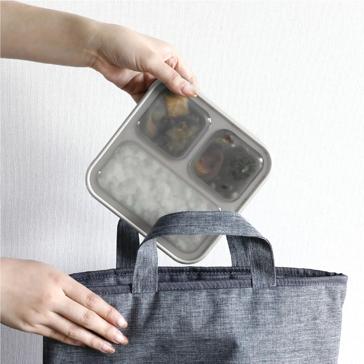 立てて持ち運べるので、バッグに入れてもすっきり、かさばらずに運べます。汁漏れを気にしなくていいので、快適に運べます。通勤や通学に最適な新発想の薄型お弁当箱です。