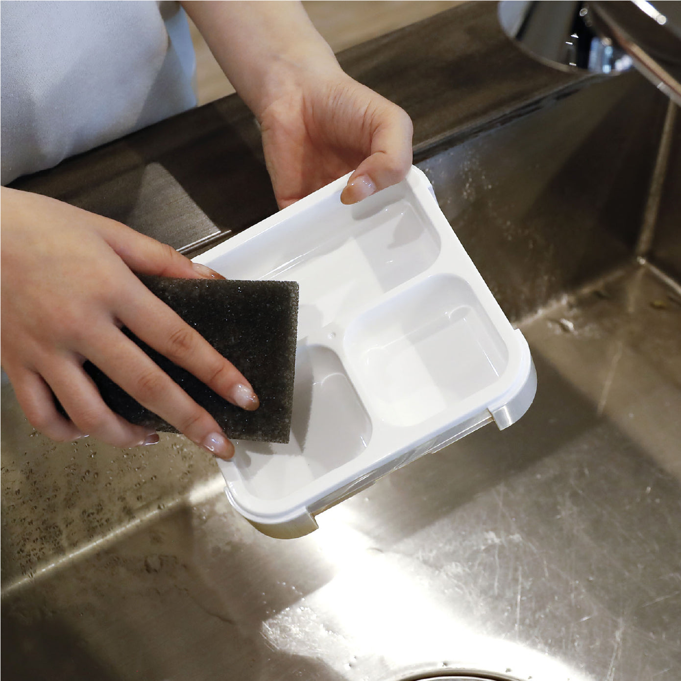 一体型の中仕切りにより、詰めるだけで簡単にお弁当が完成!悩むことなく楽しく盛り付け出来ます。フタを外してレンジ加熱も出来るので、ワンプレートディッシュのように食べられます。