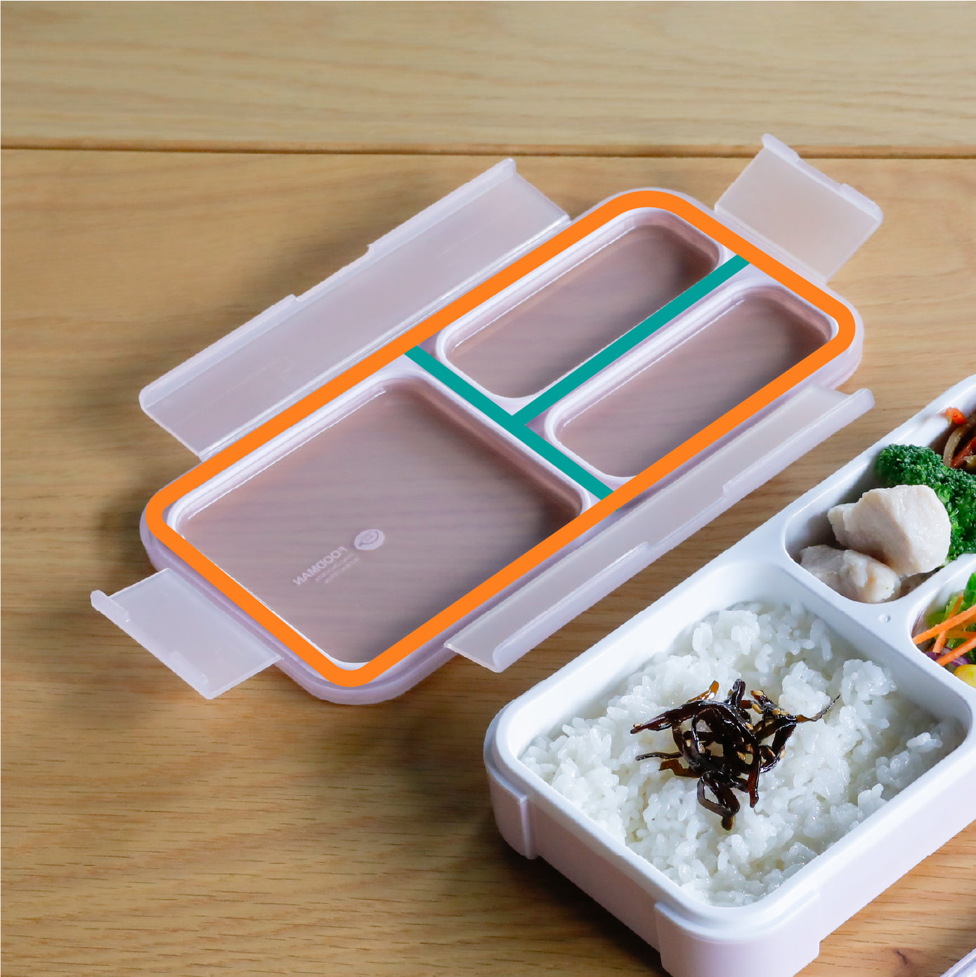 一体型の中仕切りにより、詰めるだけで簡単にお弁当が完成!悩むことなく楽しく盛り付け出来ます。フタを外してレンジ加熱も出来るので、ワンプレートディッシュのように食べられます。