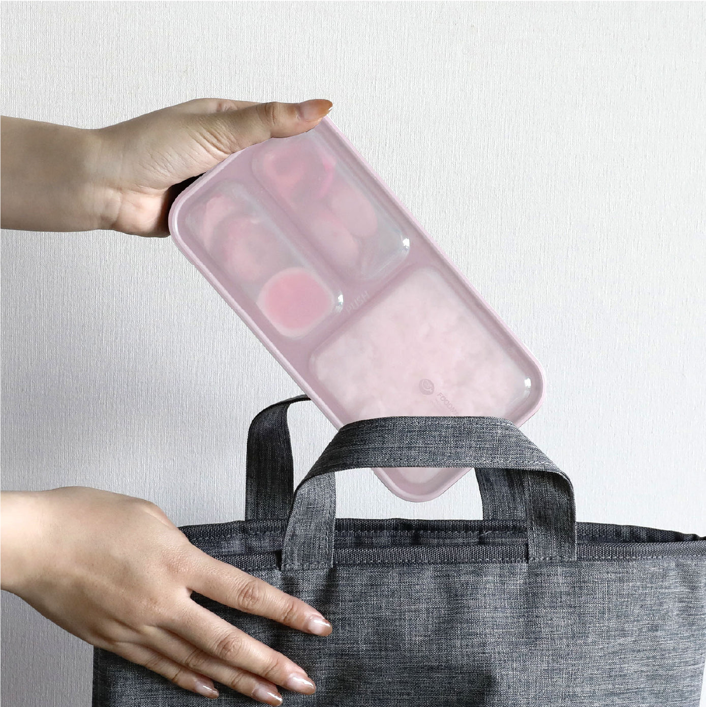 立てて持ち運べるので、バッグに入れてもすっきり、かさばらずに運べます。汁漏れを気にしなくていいので、快適に運べます。通勤や通学に最適な新発想の薄型お弁当箱です。