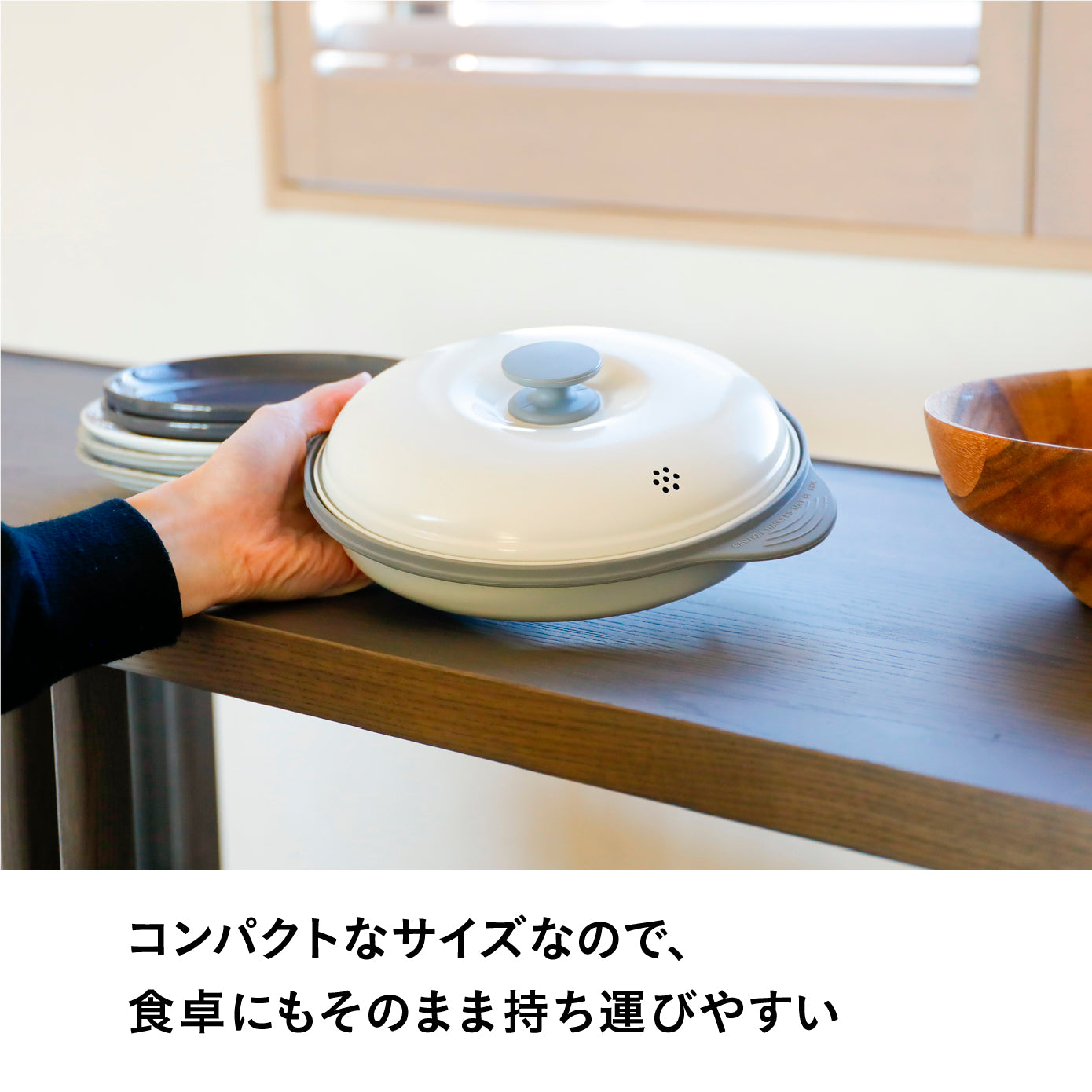 商品サイズは幅が30cm未満、高さが10cm未満とコンパクトな設計。重さも577gと軽量で持ち手も付いてるので、食卓にもそのまま持ち運びやすく、棚からの出し入れも簡単です。