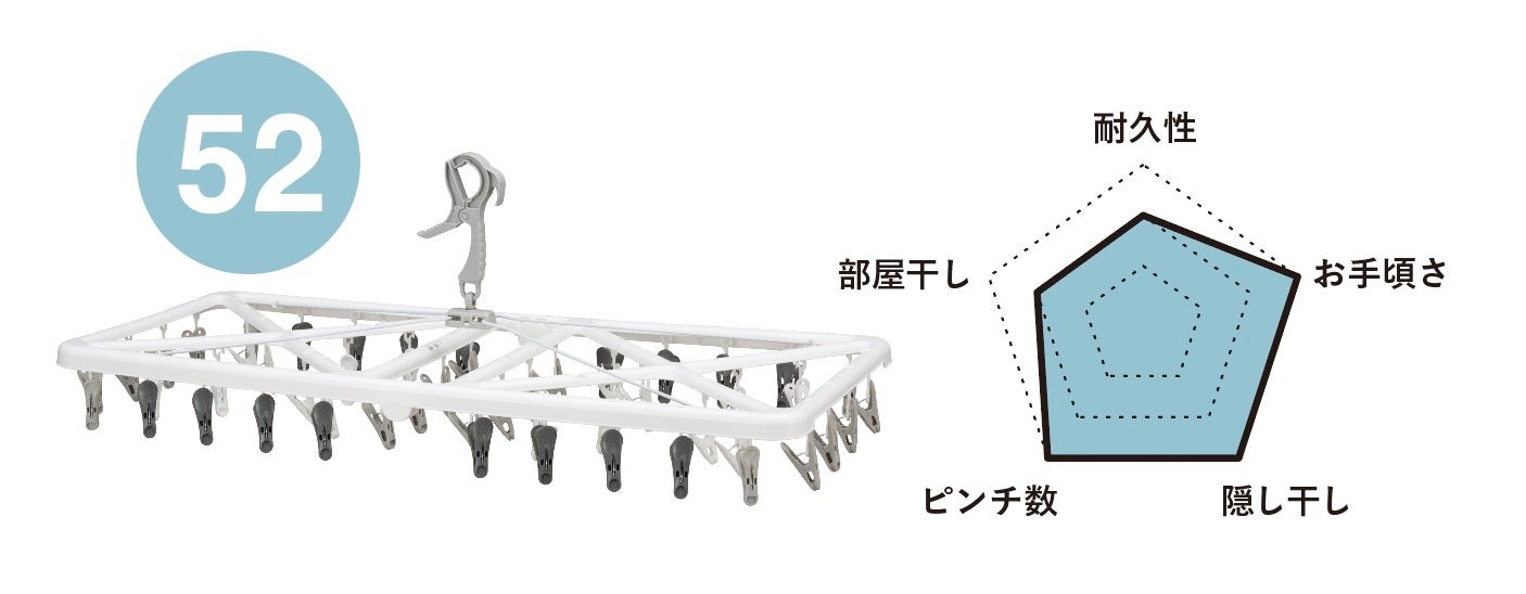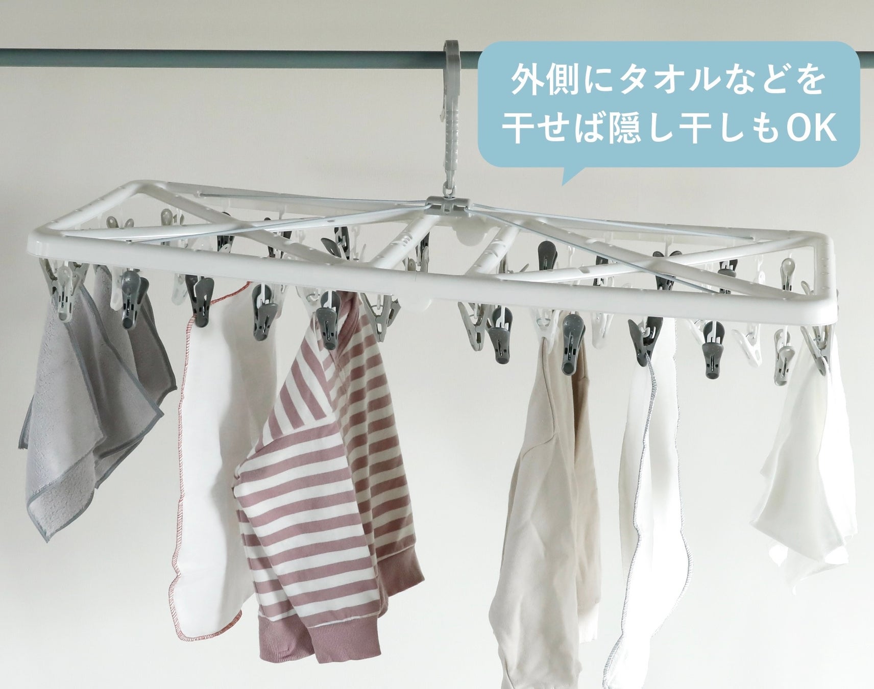たっぷり干せる52ピンチ付き!内側に見せたくない下着を、外側にタオルなど大きめのものを干せば隠し干しも出来ます。ほどよく間隔が空いたピンチの配置なので、干しやすいのもポイントのひとつです。
