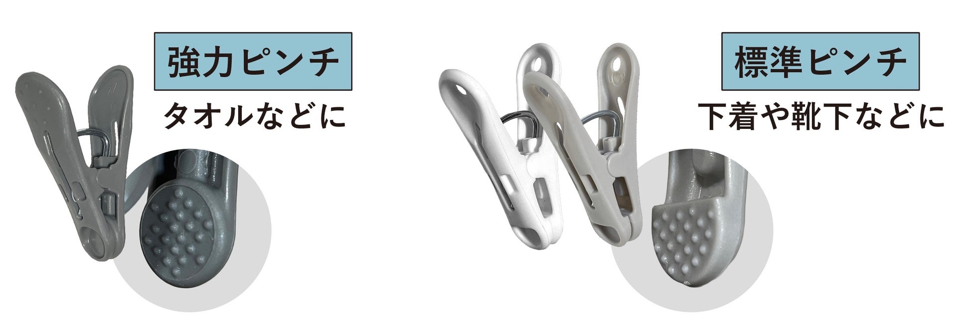 ホワイト、ライトグレーの標準ピンチ、ダークグレーの強力ピンチの2種類のピンチが付いています。強力ピンチは挟む面が少し広めになっている分、標準ピンチに比べてつかむ力が強いピンチです。タオルなど少し大きめの洗濯物を干すのに便利です。