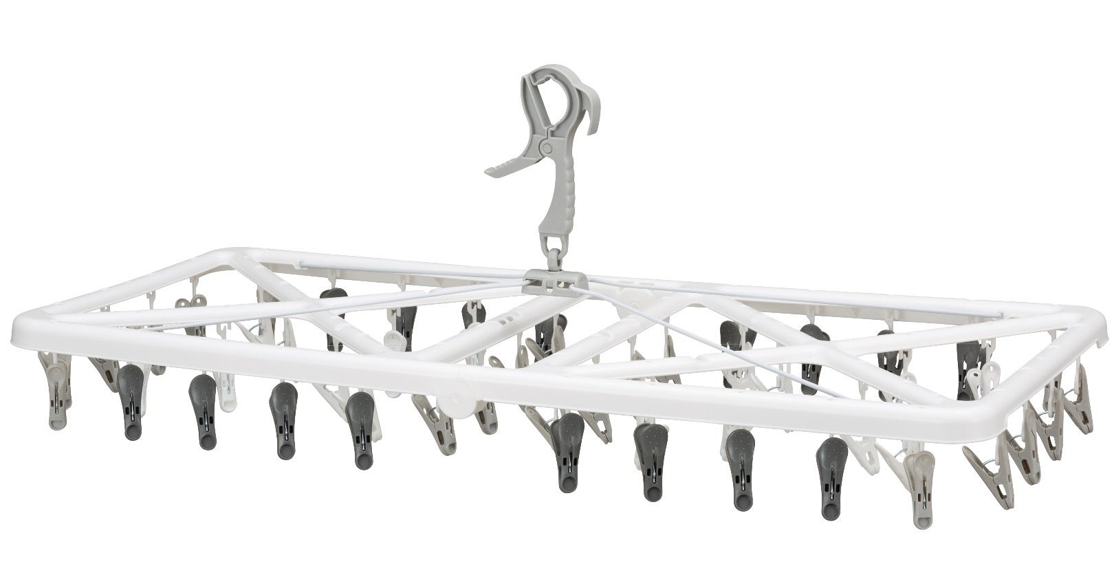 ボトムスから靴下などの小物まで、まとめて干すのに便利な「ランドリーハンガー52ピンチ」キャッチ式フックなので屋外干しも安心。干し方を工夫して内側に下着などを隠して干すことができます。ステンレス製の洗濯物干しハンガーに比べ、軽量で持ち運びもしやすい