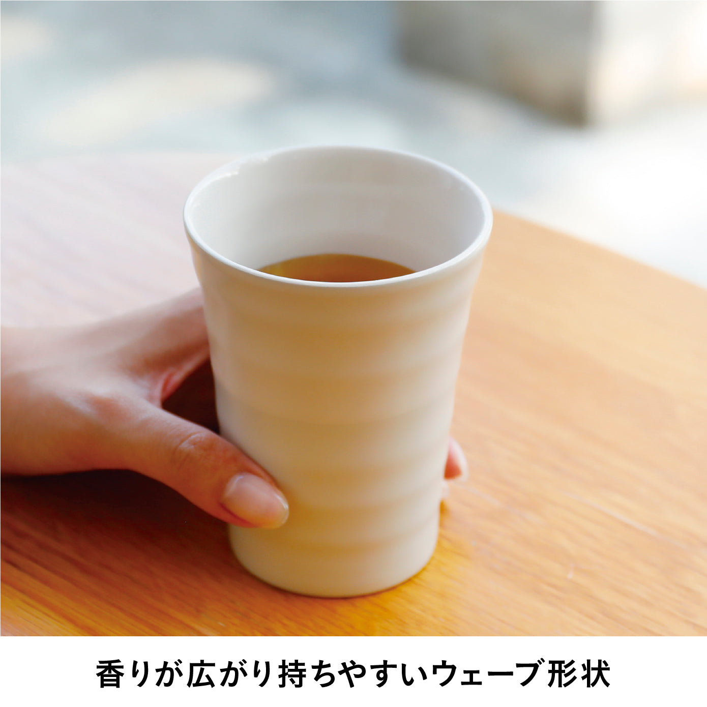 香りが広がる広口形状と、手にフィットするカーブのある凹凸デザイン。持ちやすさと美しさを兼ね備えたデザインです。