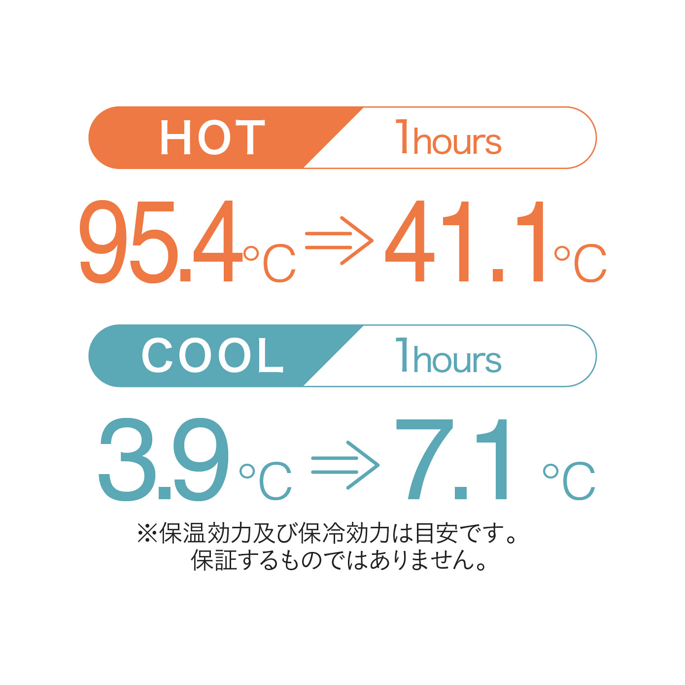 保温効力/95.4℃→41.1℃以上(1時間)、保冷効力/3.9℃→7.1℃以下(1時間)