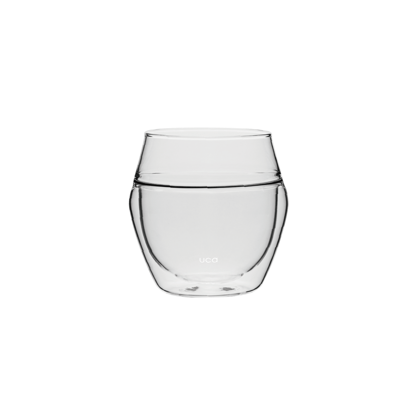 このグラスのころんとした丸みは手にフィットしやすく、持ちやすいのが特徴です。また、二重構造(ダブルウォール)により、見た目(飲み物の色合いや層)を楽しみながら、快適な飲み心地を提供します。
