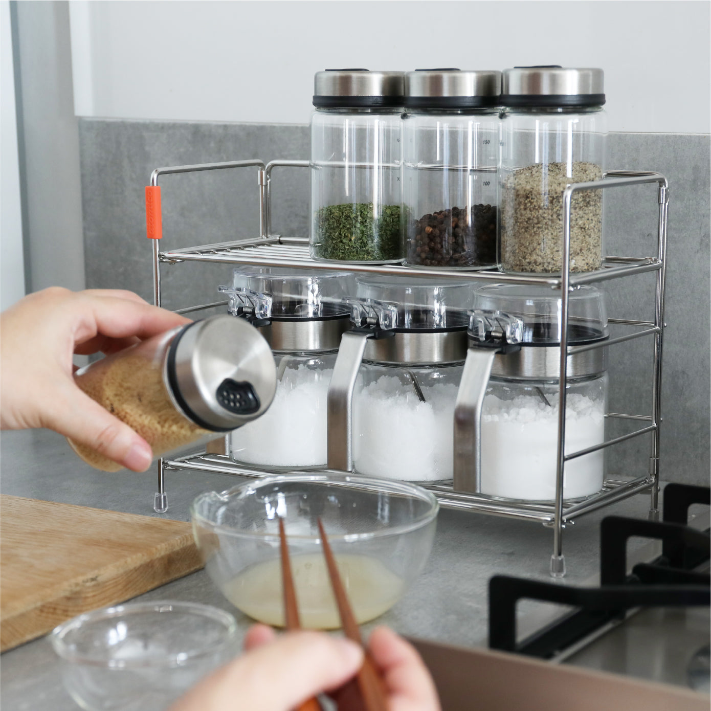 1段使い、2段使いのどちらでも使用でき、様々な大きさの調味料を置くことが可能です。調理中に「サッと」調味料を取り出すことができます。