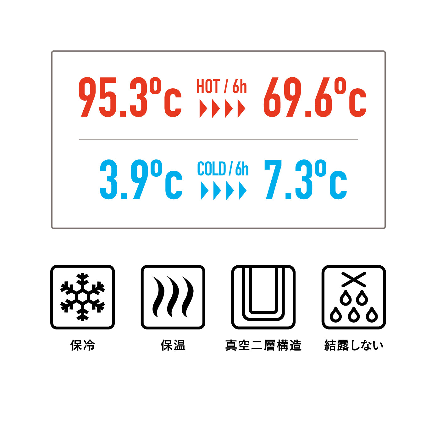 優れた保温・保冷効果を発揮し、飲み頃の温度を長時間保ちます。また、冷たい飲み物を入れても結露しないため、カバンの中やデスクが濡れる心配もありません。