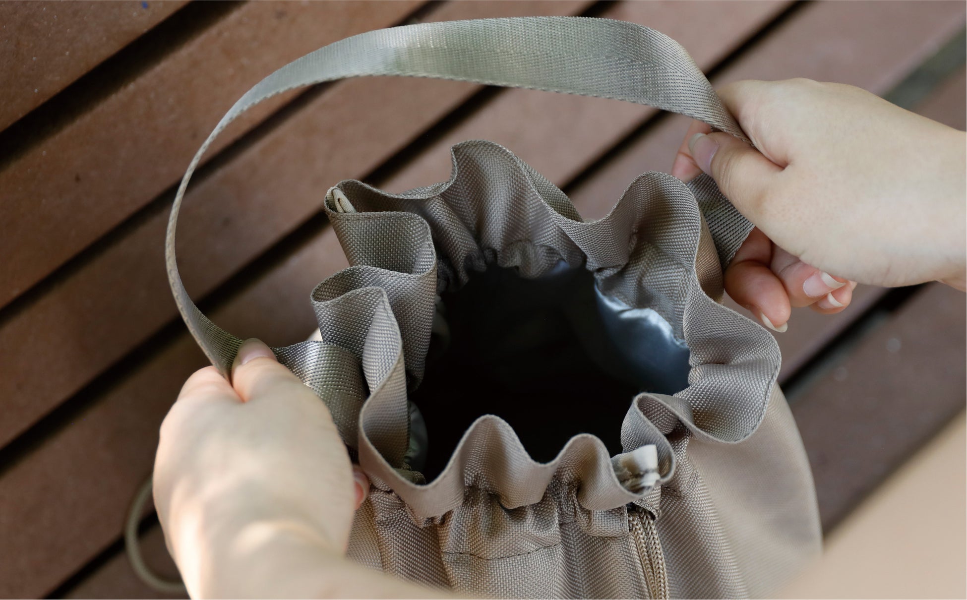 閉めるときは紐を引っ張り、開けるときはハンドルを持てば簡単に開きます。開閉しやすい保温・保冷バッグです。