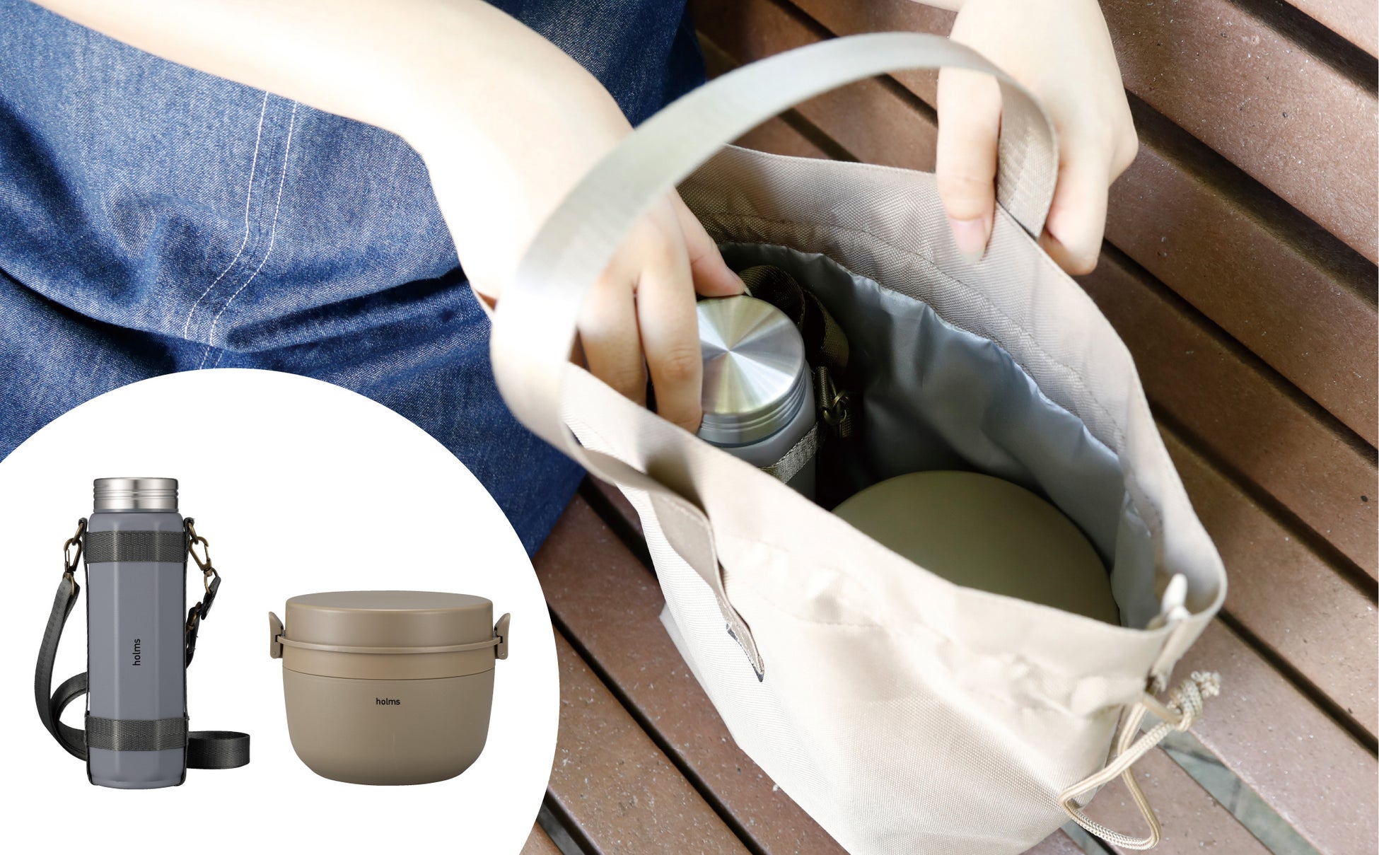 巾着型のころんとしたシンプルなデザインの「holms(ホルムス)ランチジャーバッグ」内面はシルバーコーティングされ、お弁当箱もスッポリ収まる幅広な底マチ。毎日のお弁当はもちろん、アウトドアやドライブ、運動会など行楽シーズンにも大活躍